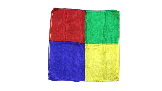 El mago muestra cuatro pañuelos de seda de distintos colores, rojo, verde, azul y amarillo los introduce uno a uno en el interior de su puño cerrado, a continuación el mago hace un chasquido mágico y los 4 pañuelos se han transformado en un pañuelo grande multicolor… ¡como lo hizo!…