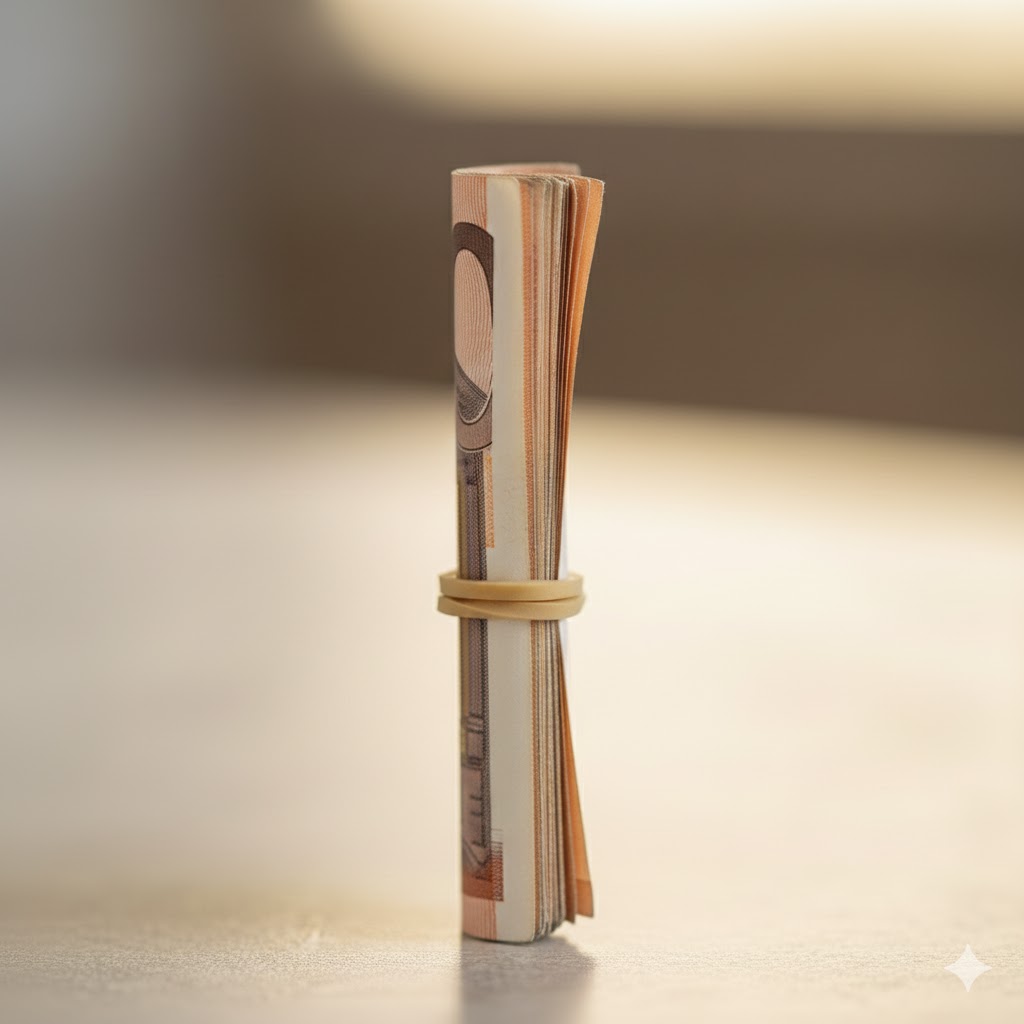 Lo mejor de este pañuelo es que con un único accesorio podemos hacer desaparecer anillos finos o billetes enrollados, lo que necesitemos. Esto nos hará la vida mucho más fácil a la hora de tener que hacer desaparecer estos objetos en rutinas de magia como el «anillo/billete al limón» o «anillo al huevo». Ya no necesitarás dos pañuelos distintos para hacer desaparecer anillo o billetes, solo con este fantástico pañuelo «double kill» serás capaz de hacer desaparecer lo que necesites. Advertir que el billete que esta dentro del pañuelo simula ser un billete enrollado con una goma elástica a su alrededor, por lo que a la hora de hacer desaparecer un billete prestado, se tendrá que enrollar con una goma elástica a su alrededor como se puede ver en la imagen de abajo. En caso necesario también podemos hacer desaparecer otros objetos que no sean billetes, como por ejemplo un papel o carta enrollados del mismo modo que podemos enrollar un billete, el espectador no notará la diferencia.